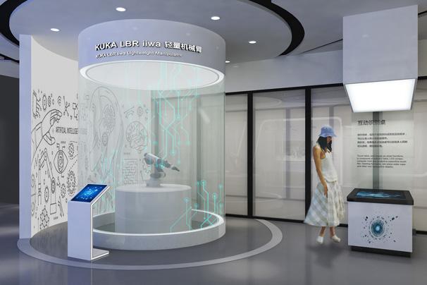 “企業數字化”、“騰飛未來”等板塊,展廳主要通過搭建多個場景還原訊飛產品在現代生產生活中的應用,同時通過互動觸摸屏、物體識別桌、機械臂、VR等創意性展項,將訊飛企業理念、產品核心賣點與展項及場景相融合,智能化的展項與科技風的空間風格既凸顯了科大訊飛企業智能化的特點,同時也助力展示企業的核心優勢與價值理念。